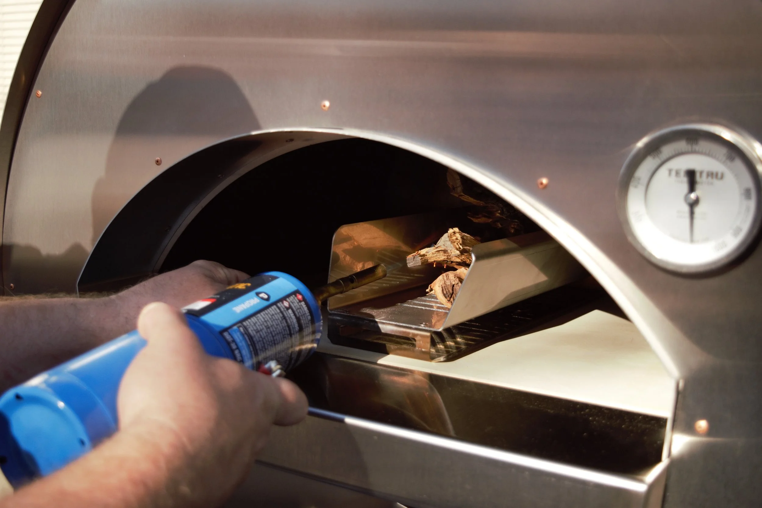 Position oven door Position the oven door on the oven deck, making sure to leave one side partially open, creating about a 2 inch gap to ensure the fire receives ample airflow.